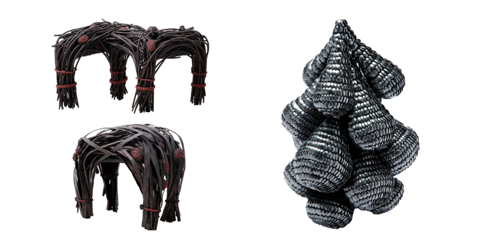 | ▲ (좌) 이소명, 〈물질의 연대기〉, 2025, 스팀 벤딩 오크 나무, 황토, 로프 및 혼합 재료, 600 × 1100 × 550 mm / (우) 박지은, 〈순환의 씨앗〉, 2025, 산화 스털링 실버, 리넨 실, 153 × 153 × 254 mm ©로에베 재단 |