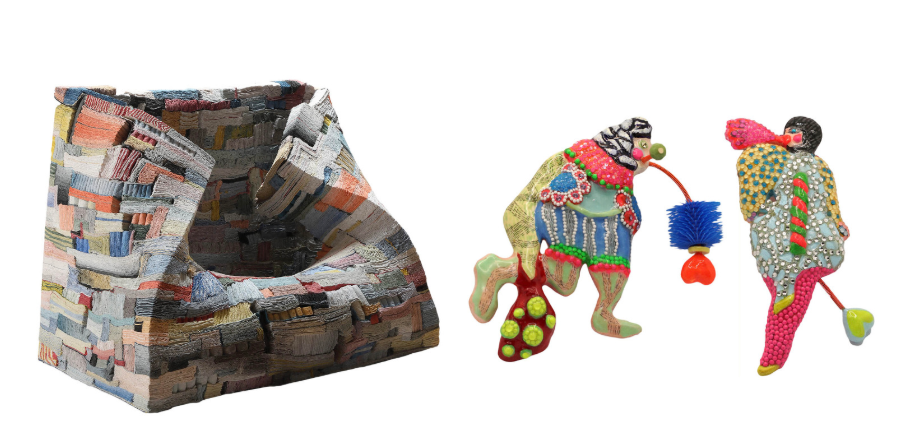 | ▲ (좌) 박종진, 〈착시의 층위〉, 2025, 도자기, 종이, 스테인, 유약, 750 × 450 × 560 mm / (우) 성코코, 〈그림자 꼭두〉, 2025, 점토, 래커, 컬러 철사, 비즈, 스와로브스키 스톤, 가변 크기 ©로에베 재단 |