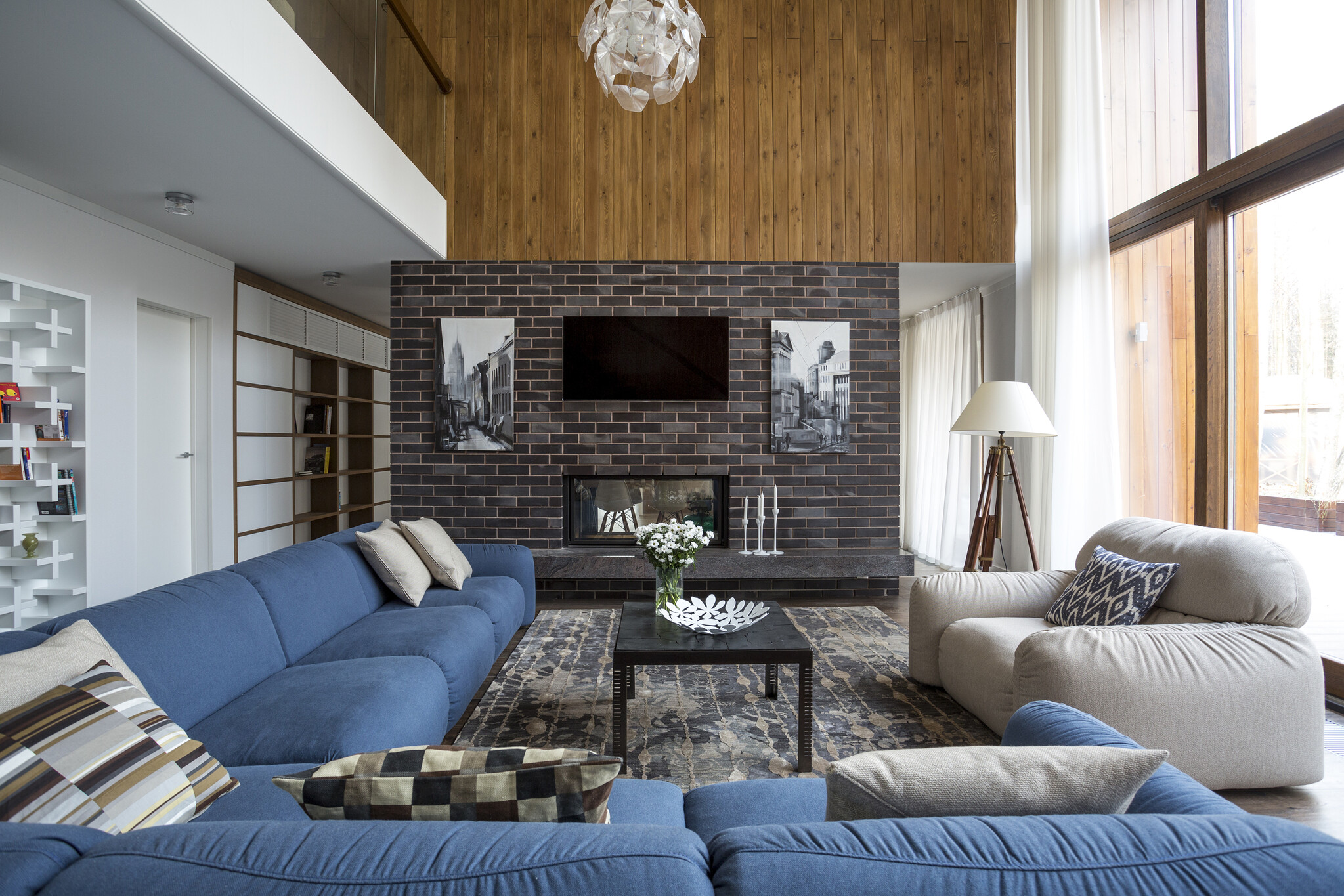 목재 이외에도 주요하게 쓰인 인테리어 소재는 회색 벽돌이다. 벽돌은 벽난로의 벽 마감과 부엌에 일부분 사용됐다. 나무만 쓰기보다 적절히 소재를 배합해 단조로움을 없앴다. 무엇보다 회색 벽돌로 인해 집 안은 한층 더 모던한 인테리어를 이끌어낼 수 있었다. 천장은 화이트 컬러로 마무리하고, 간접 조명을 사용해 회색 벽돌과 자연스러운 컬러 그라데이션을 이뤘다, 공간은 나무의 따뜻함과 모노톤 컬러의 조합으로 깔끔하게 꾸며졌다.