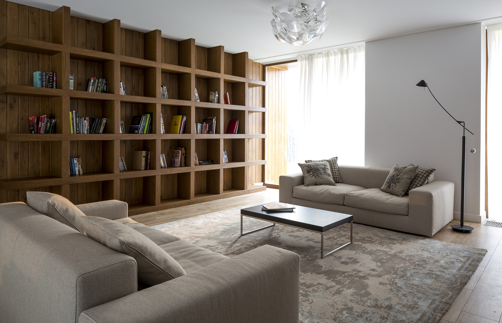 집의 중심이 되는 공간은 2단 창문이 설치된 거실이다. 거실의 커다란 2단 창은 햇빛과 바깥의 공기가 실내에 충분히 들어올 수 있는 환경을 제공한다. 반면 남쪽에서도 빛이 들어올 수 있도록 뒤편에도 창문을 냈다. 거실의 벽은 외장재와 마찬가지로 낙엽송으로 마감했다. 나무의 따뜻한 색감이 모스크바 특유의 서늘한 분위기를 훈훈하게 만들어주었다.