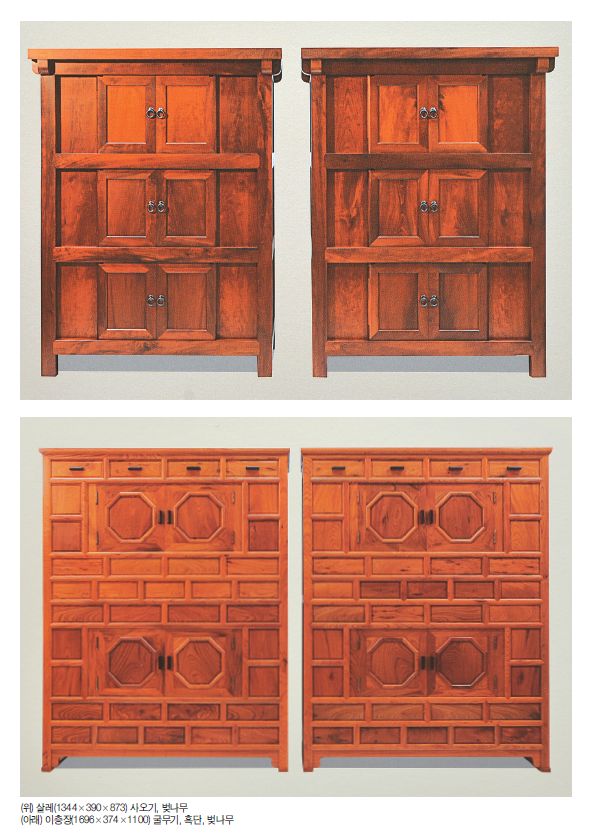 사오기 특유의 질감을 살려 양승필 소목장이 현대적으로 재해석하고 변형시킨 살레와 전통가구들은 수더분하면서도 맵시가 빼어나다. 찬장이라는 폐쇄형 가구의 원형을 유지하되, 살레는 이제 부엌에서 뛰쳐나와 안방, 거실, 서재 그 어디에도 어울릴 수 있는 자유분방한 가구로 재탄생되었다. 살레뿐만이 아니다. 머릿장이나 이층장, 서안에서 소반까지 그가 만드는 가구에는 양승필 소목장 특유의 단아함과 전통과 현대의 경계에서 기품을 잃지 않으면서도 세련미를 겸비하고 있다.