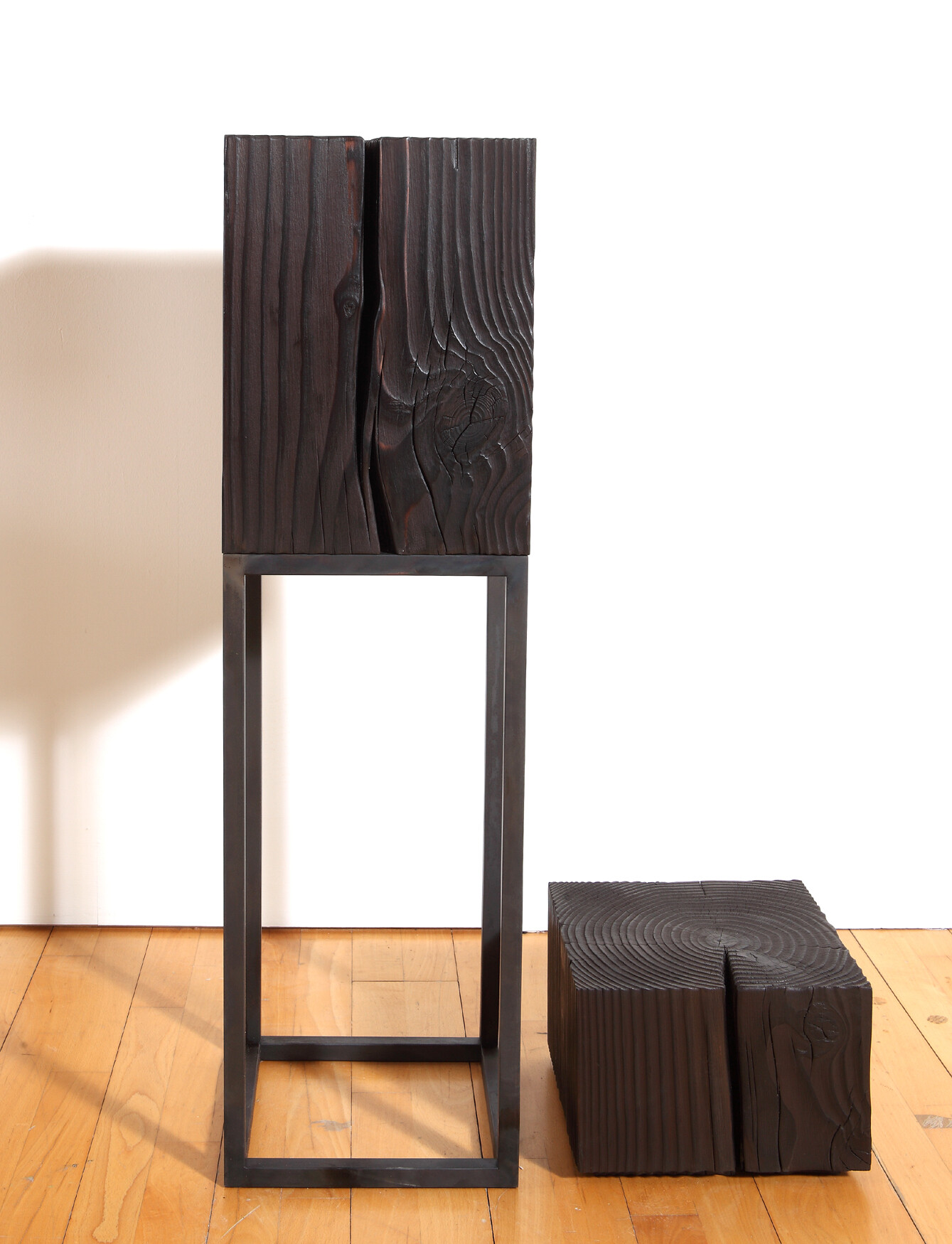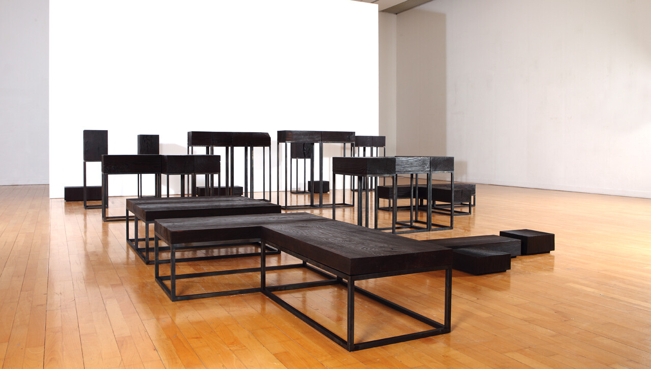 그런데 이번 작품은 달랐다. 사물에 대한 그의 정의는 같았지만, 이를 전혀 다른 방식으로 표현한 것이다. 2015 둠 시리즈의 작품들은 모두 같은 색감과 형태로 공간에 놓여 있었다. 까맣게 탄 나무와 이를 받치고 있는 금속이 만나 하나의 선을 이루고 있어, 어디까지가 나무이고 금속인지 그냥 보아서는 알아차리기 어려웠다.