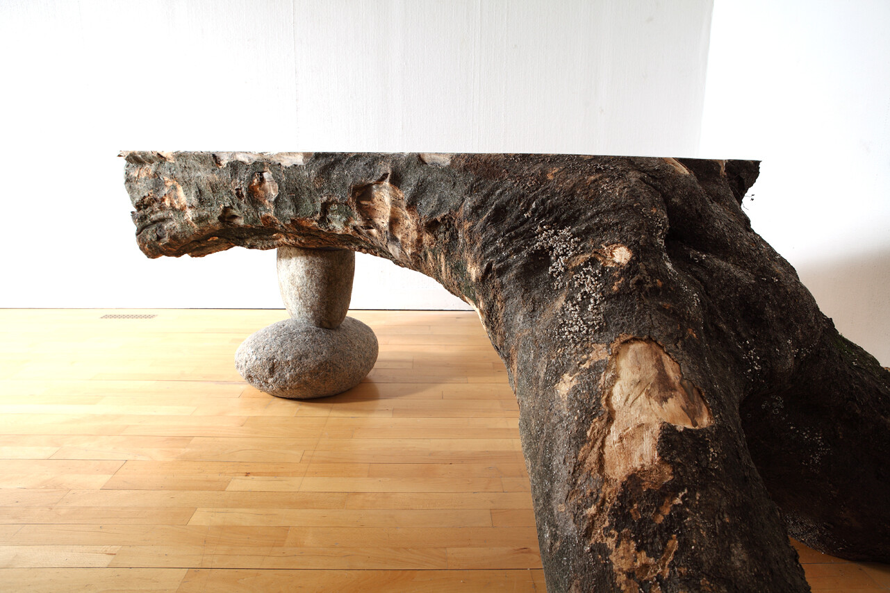 나무와의 거리가 가까워지자 미처 발견하지 못했던 부분까지 눈에 들어왔다. 테이블을 받치고 있는 다리가 다름아닌 돌이었다. 지리산에서 공수한 마천석은 나무의 단단한 표피와도 닮아 있었다. 자연이 만들어낸 두 소재의 조합은 위화감 없이 어우러지고 있다. 여기에 인간이 더해진다면, 이 또한 자연스러운 조화를 이뤄낼 수 있을까. 작가의 테이블은 자연이 만들어낸 위대함 앞에 인간이 할 수 있는 일은 고작 이를 옮기고, 배치하는 것뿐이라는 점을 상기시킨다. 이 작품에서도 작가의 역할은 그리 많지 않았다. 디자인을 가미하거나 특별한 기술로 제작한 것이 아니기 때문이다. 그저 나무의 있는 그대로의 모습을 살리고, 관람객들에게 잘 전달하도록 이를 전시실로 옮기는 것뿐일 테다.