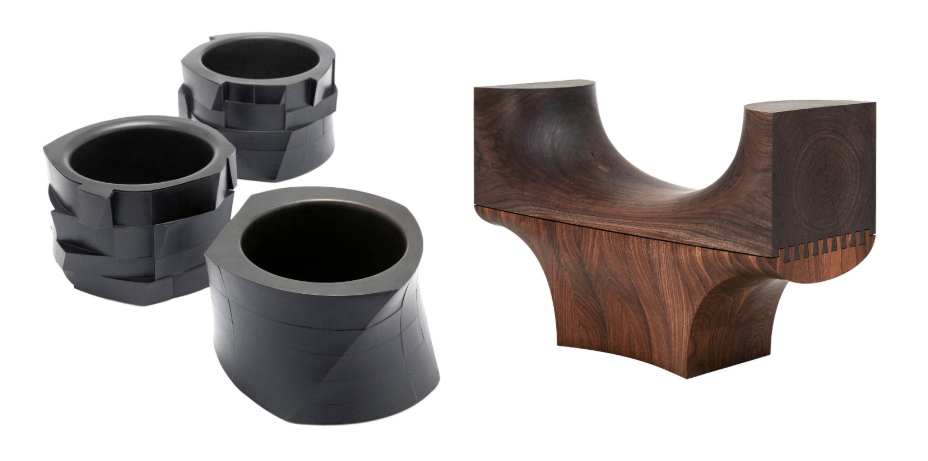 | ▲ (좌) 조수현, 〈재구성된 시선 그릇 3C1L〉, 2025, 실리콘 청동, 각 250x250x150mm / (우) 이종인, 〈배흘림〉, 2025, 호두나무, 975x400x615mm ©로에베 재단 |