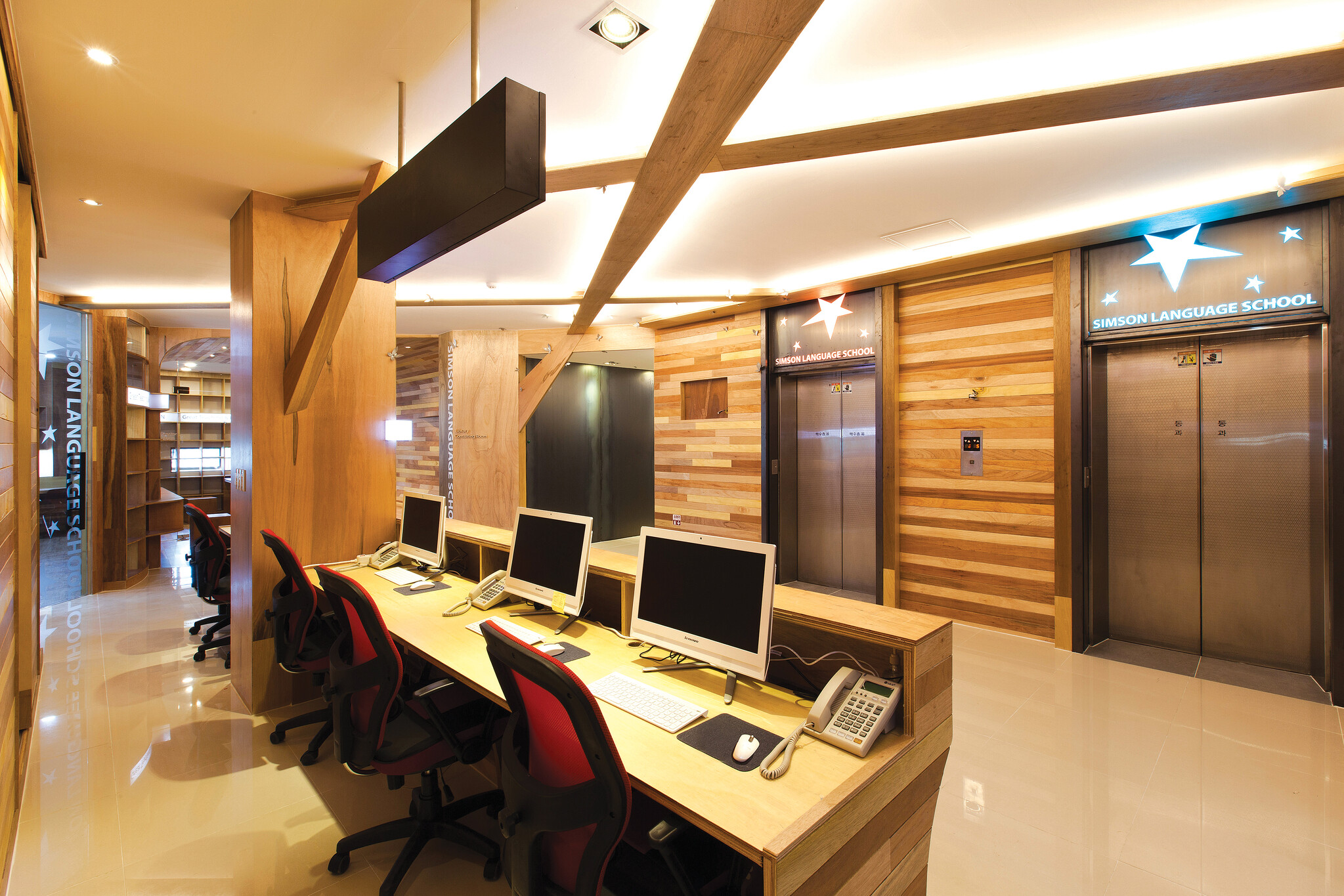 학원의 기본은 좋은 교육에 있다. 하지만 이것은 모든 학원이 내거는 슬로건이다. 그 속에서도 질과 양의 차이는 있다. 하지만 학원의 공간에 대한 인식을 새롭게 설정하고 지속적으로 유지하는 일은 그리 간단하지 않다. 심슨어학원의 심호길 대표는 윤종현 소장과 꾸준히 작업을 함께했다. 심 대표는 윤 소장의 아이디어와 뚝심을 샀고, 윤 소장은 심 대표의 교육 가치와 남다른 안목에 동조했다. 이 두 사람은 목재의 감성과 가치를 공유하면서 심슨만의 공간을 창출했다.