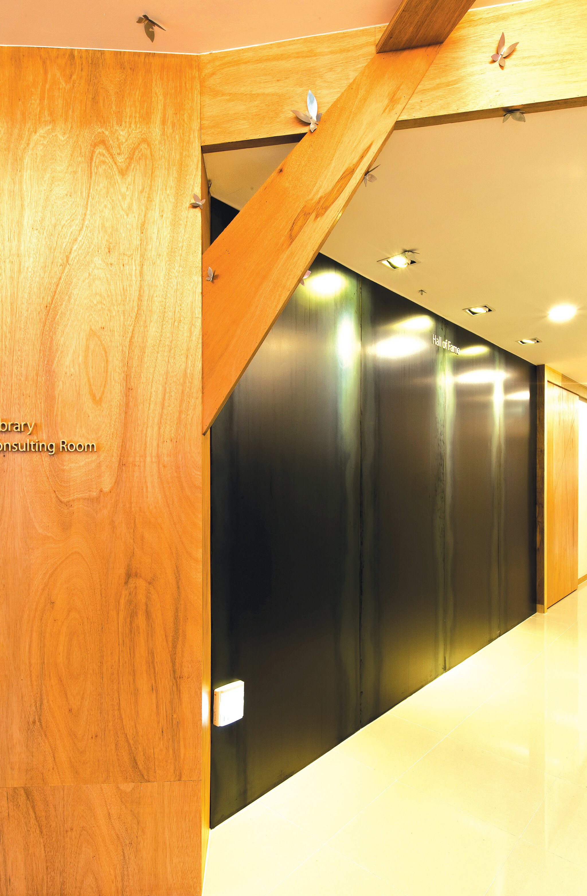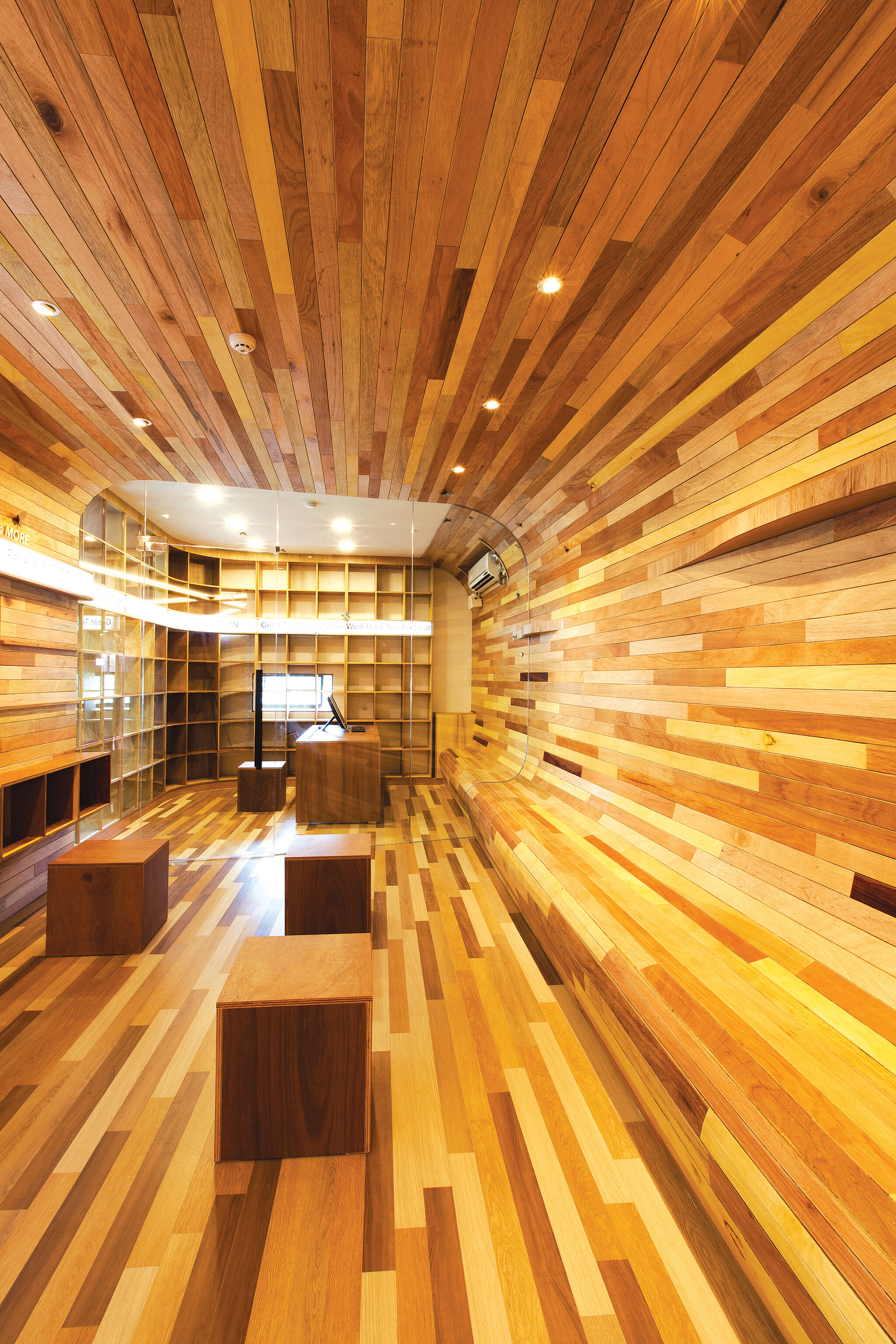 학원 내부는 안내 데스크를 중심으로 부채꼴로 길게 펼쳐져 있다. 안내 데스크는 학생들의 동선을 한 눈에 파악하기 위한 것이다. 다섯 번째 이곳을 디자인해 온 ‘메이크 人’ 윤종현 소장은 안내 데스크의 중심선을 심슨어학원의 공간 브랜드로 설계해 지속해오고 있다. “어학원은 무엇보다 목적성 설계를 해야 합니다. 그러나 개성이 다양한 아이들을 공부 만큼이나 관리도 중요해, 마치 망루에서 공간을 내려다보듯이 안내 데스크는 효과적으로 시야를 확보하는데 집중했다.”고 말했다. 내부 벽의 대부분은 목재 수종별로 합판을 길게 잘라 붙였다. 잘라진 목재는 독특하게 디자인한 윤 대표의 설계 궤적을 따라가면서 전혀 다른 가치로 바뀌었다. 때론 감성으로 혹은 화려함으로, 콘크리트의 차가움과 단조로움이 따뜻함과 생기의 공간으로 재탄생했다.