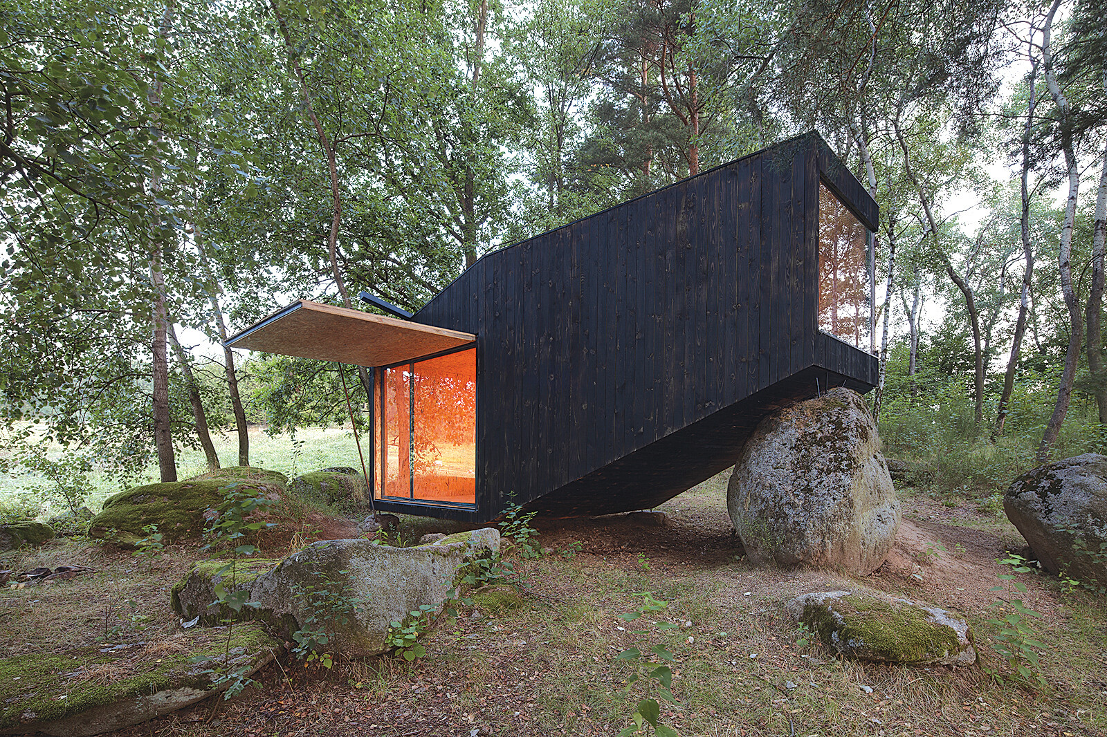 나무가 우거지고 바위가 뒹구는 이 숲은 자신만의 공간을 만들기에 적절한 장소였다. 문제는 집을 세울 공간에 놓여있던 큰 바위. 보통은 공사 전에 바위를 옮길 거라 생각하지만 건축팀 Uhlik architekti는 숲의 공간 그대로를 유지한 채 그 안에 들어가야 비로소 숲에서의 온전한 휴식이 가능하다고 봤다. 결국 바위를 치우지 않고 그 자리에 두기로 했고, 바위 덕분에 재미있는 형태의 집이 완성됐다.