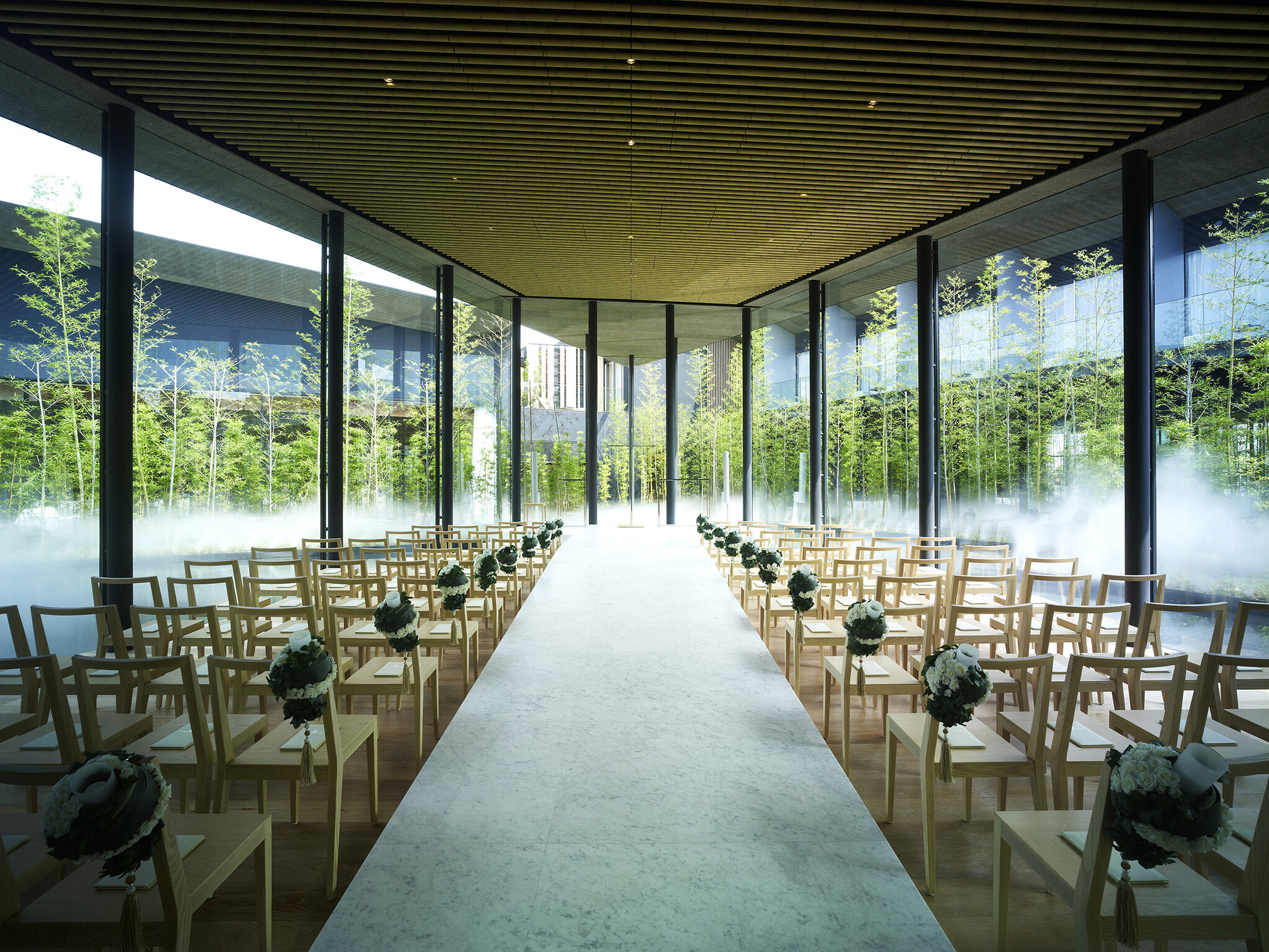 ‘정원 테라스 미야자키’는 미야자키 역 근처 버려진 공장부지에 지어진 호텔이다. 대나무와 물이 배경이 되고 있는 예배당은 전면 유리를 써서 외부환경이 내부로 그대로 유입되도록 했다. 또 호텔 외곽을 정원이 감싸고 있어서 호텔 객실은 물론 연회장, 레스토랑 등 어디에서든 자연이 감상되는 구조로 설계했다.