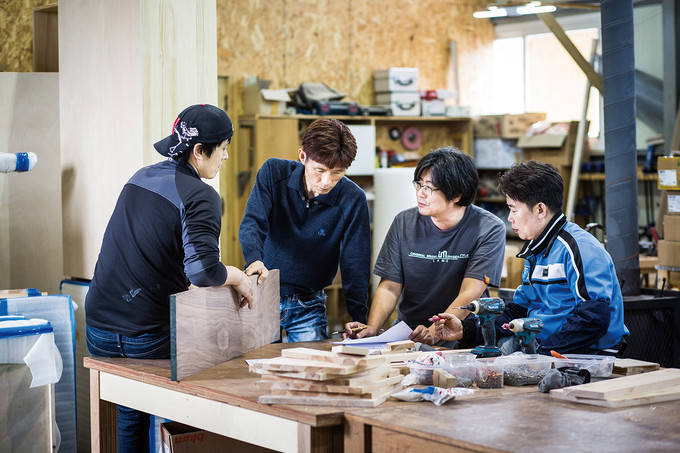 고객이 디자인, 소재 등을 선택하면 공방에서 고객의 요청사항을 검토한다. 실제 제작에 들어갔을 때 적용이 어려운 경우가 생길 수 있기 때문이다. 검토 후 제작은 공방에서 한다. 나무로 만드는 전체 프레임 제작 외에 인덕션이나 쿡탑 같은 하드웨어, 인조대리석 등 공방에서 만들지 못하는 부분들은 외부에서 주문한 뒤 공방에서 적용시키는 작업을 별도로 한다.