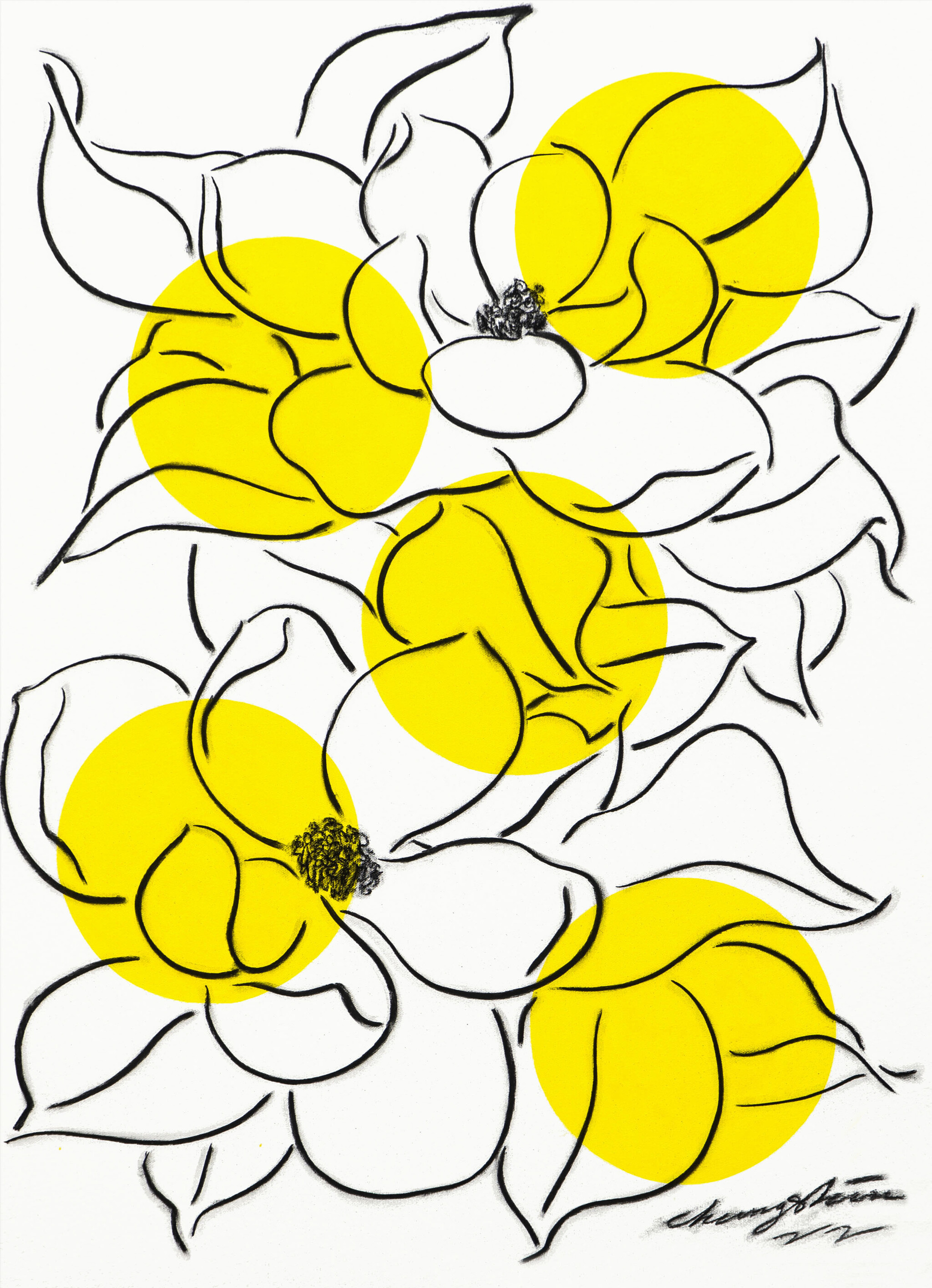 작품의 중심 흐름은 검은 심연 속으로 빠져드는 듯한 먹의의 깊이감과 부드럽게 그어진 목탄의 선이다. 검정색은 면밀하게 정비된 하얀 바탕과 화사하게 펼쳐진 노란색을 만나 네온 사인처럼 밝혀진다. 이는 마치 마음속 그늘에 환한 불을 밝히는, 관람자의 심상에 희망의 불빛을 켜는 것과 동일하다.