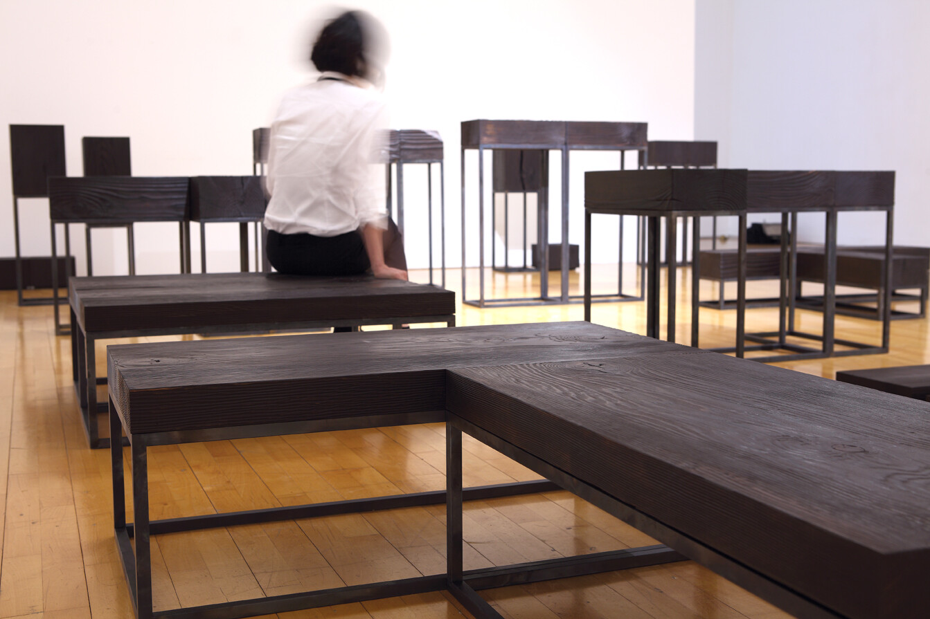 그런데 이번 작품은 달랐다. 사물에 대한 그의 정의는 같았지만, 이를 전혀 다른 방식으로 표현한 것이다. 2015 둠 시리즈의 작품들은 모두 같은 색감과 형태로 공간에 놓여 있었다. 까맣게 탄 나무와 이를 받치고 있는 금속이 만나 하나의 선을 이루고 있어, 어디까지가 나무이고 금속인지 그냥 보아서는 알아차리기 어려웠다.