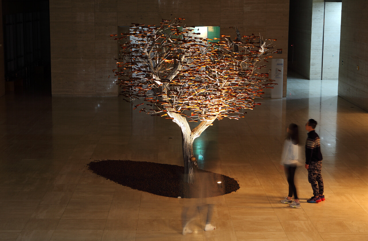 나무는 바다를 끌어 올렸다. 가지마다 물고기 나무를 매달고 있다. 동심을 자극하는 이 작품은 이용기 작가의 ‘人(인)+木(목)=休(휴)’ 시리즈 중 하나다. 미처 몰랐겠지만 이는 진짜 나무가 아니다. 표피를 덮고 있는 재료는 스테인레스기 때문이다.