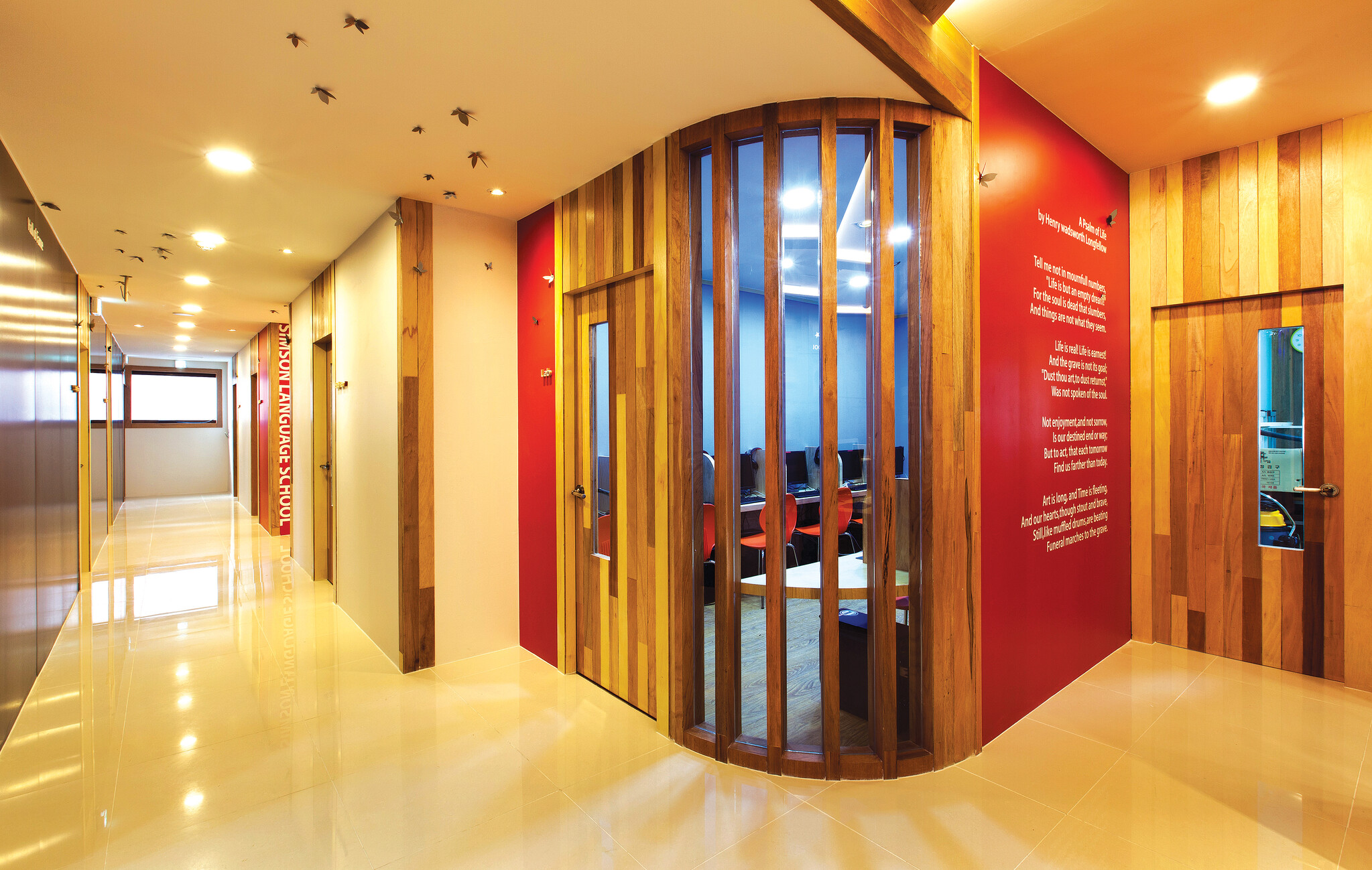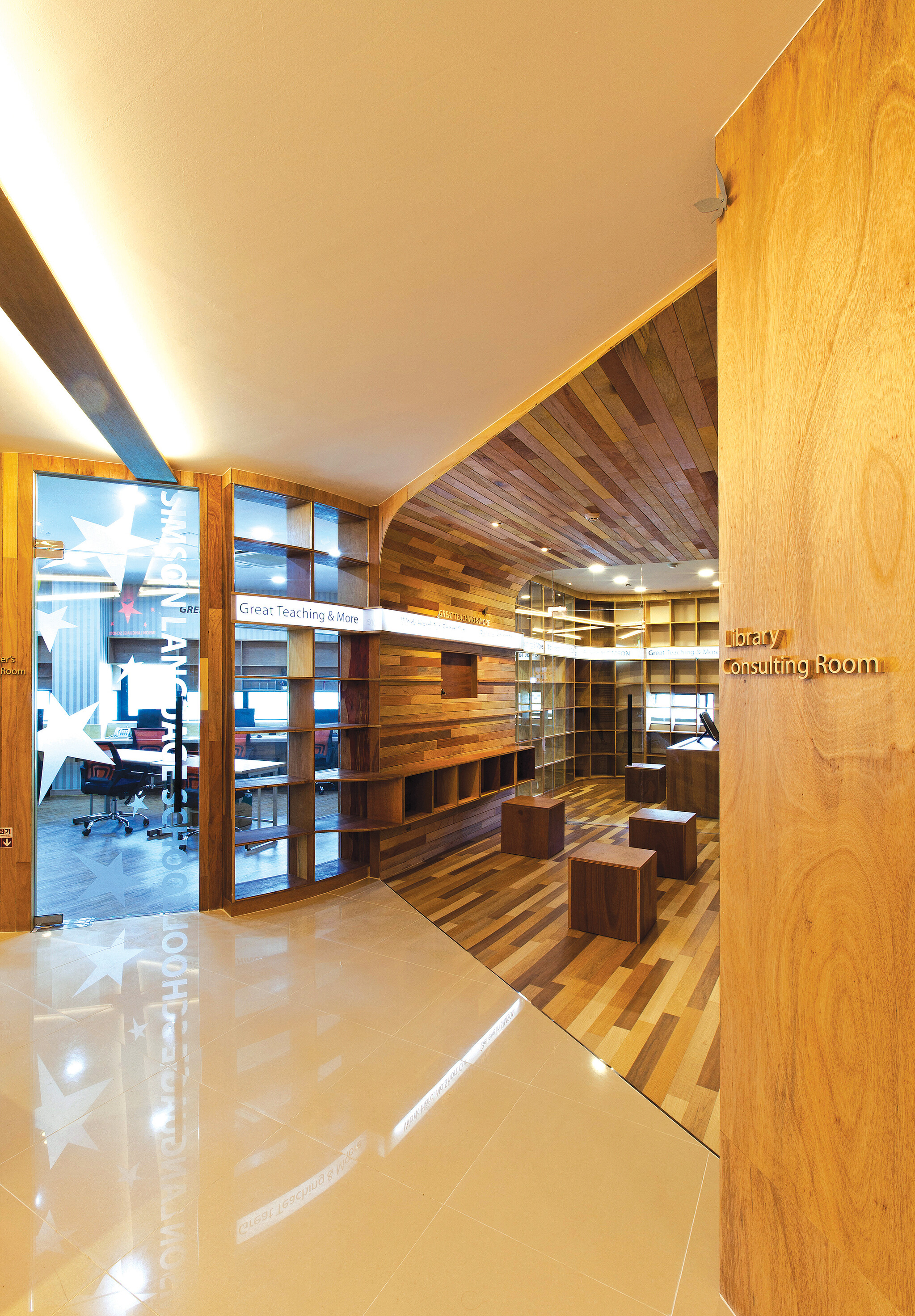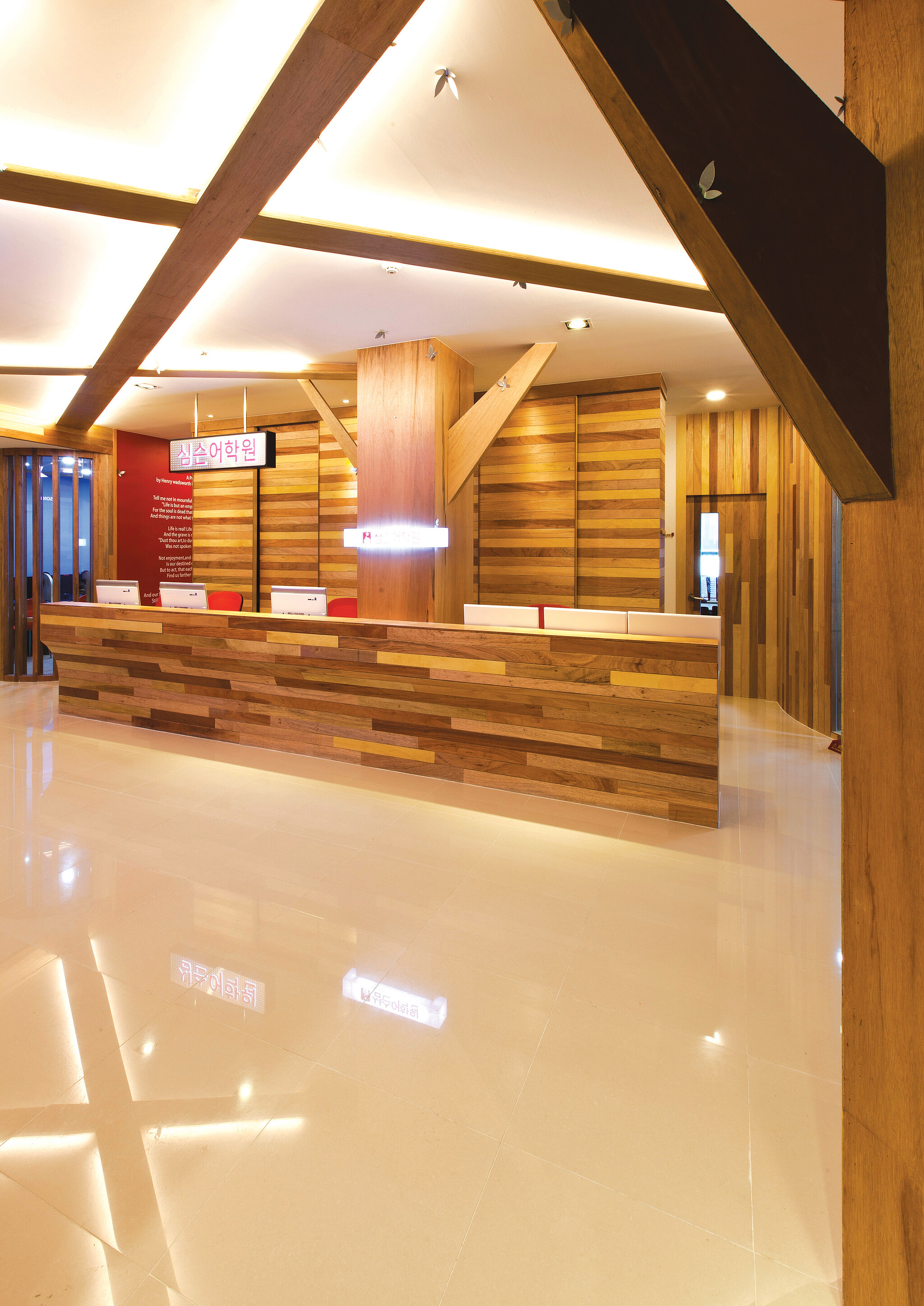 학원의 기본은 좋은 교육에 있다. 하지만 이것은 모든 학원이 내거는 슬로건이다. 그 속에서도 질과 양의 차이는 있다. 하지만 학원의 공간에 대한 인식을 새롭게 설정하고 지속적으로 유지하는 일은 그리 간단하지 않다. 심슨어학원의 심호길 대표는 윤종현 소장과 꾸준히 작업을 함께했다. 심 대표는 윤 소장의 아이디어와 뚝심을 샀고, 윤 소장은 심 대표의 교육 가치와 남다른 안목에 동조했다. 이 두 사람은 목재의 감성과 가치를 공유하면서 심슨만의 공간을 창출했다.