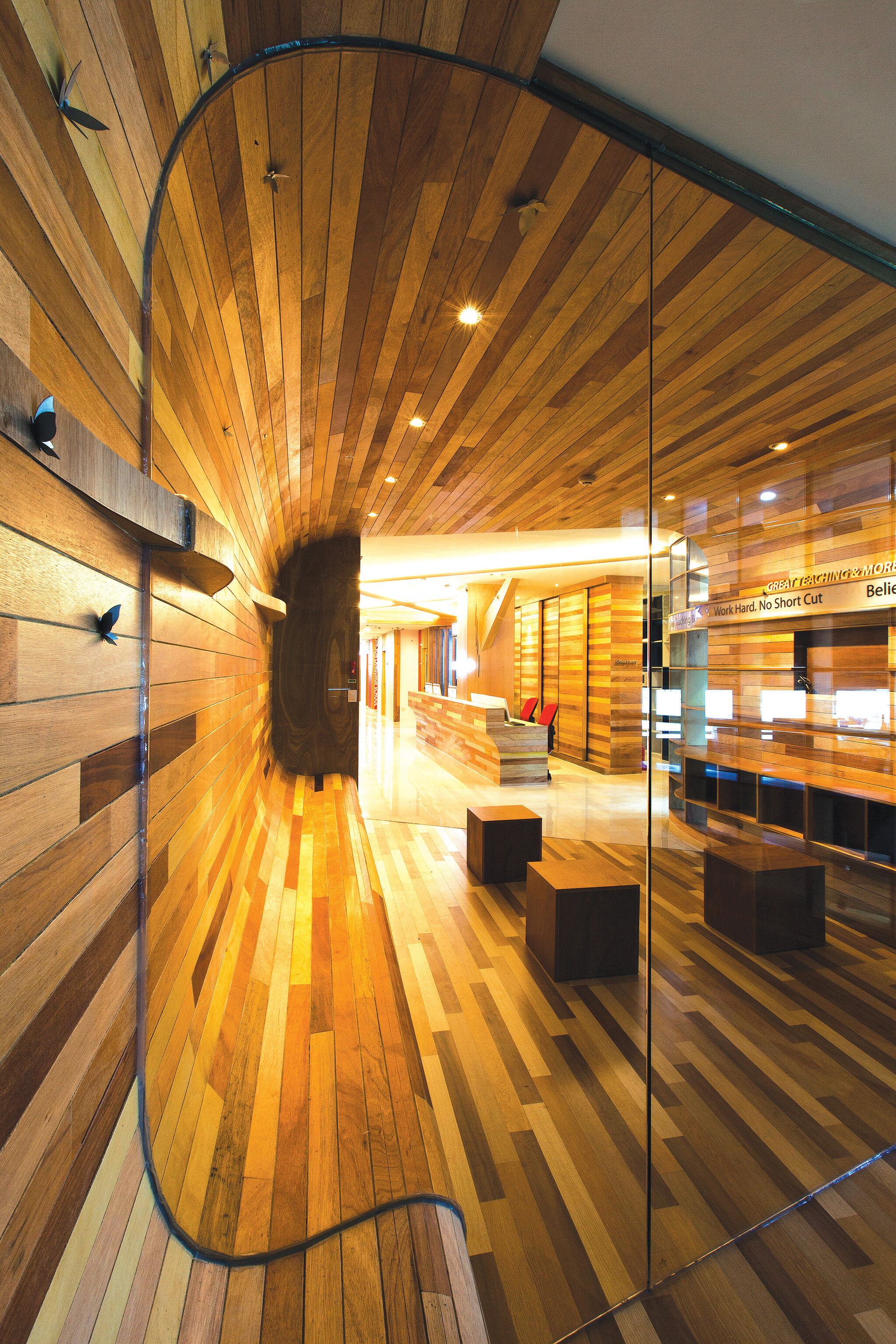 학원 내부는 안내 데스크를 중심으로 부채꼴로 길게 펼쳐져 있다. 안내 데스크는 학생들의 동선을 한 눈에 파악하기 위한 것이다. 다섯 번째 이곳을 디자인해 온 ‘메이크 人’ 윤종현 소장은 안내 데스크의 중심선을 심슨어학원의 공간 브랜드로 설계해 지속해오고 있다. “어학원은 무엇보다 목적성 설계를 해야 합니다. 그러나 개성이 다양한 아이들을 공부 만큼이나 관리도 중요해, 마치 망루에서 공간을 내려다보듯이 안내 데스크는 효과적으로 시야를 확보하는데 집중했다.”고 말했다. 내부 벽의 대부분은 목재 수종별로 합판을 길게 잘라 붙였다. 잘라진 목재는 독특하게 디자인한 윤 대표의 설계 궤적을 따라가면서 전혀 다른 가치로 바뀌었다. 때론 감성으로 혹은 화려함으로, 콘크리트의 차가움과 단조로움이 따뜻함과 생기의 공간으로 재탄생했다.
