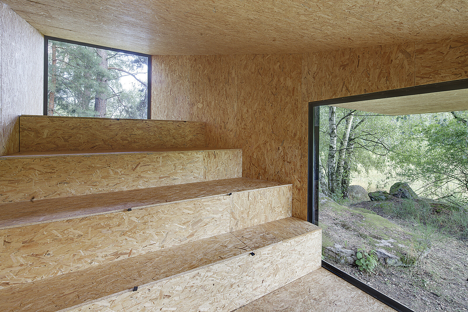 집 한쪽을 바위 위에 걸치는 형태로 설계가 되면서 내부에 생기는 경사는 계단식으로 처리했다. 계단은 책꽂이가 되기도 하고 벤치가 되기도 하고 맨 위층에 침대시트를 놓으면 침대가 된다. 외관은 단단한 낙엽송을 태운 목재를 사용했다. 검게 탄 나무 덕분에 집은 눈에 잘 띄지 않게 됐고 은신처로서의 성격이 더욱 강해졌다. 나무 작업은 지역 목수의 도움을 받았다. 내부 바닥은 집을 지을 땅에 쓰러져 있던 나무들로 만들었다. 죽어 있던 나무가 같은 장소에서 새로운 의미로 거듭났다.