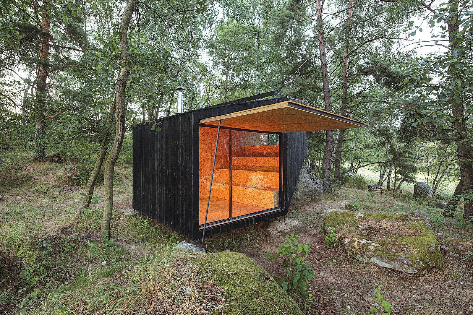 나무가 우거지고 바위가 뒹구는 이 숲은 자신만의 공간을 만들기에 적절한 장소였다. 문제는 집을 세울 공간에 놓여있던 큰 바위. 보통은 공사 전에 바위를 옮길 거라 생각하지만 건축팀 Uhlik architekti는 숲의 공간 그대로를 유지한 채 그 안에 들어가야 비로소 숲에서의 온전한 휴식이 가능하다고 봤다. 결국 바위를 치우지 않고 그 자리에 두기로 했고, 바위 덕분에 재미있는 형태의 집이 완성됐다.