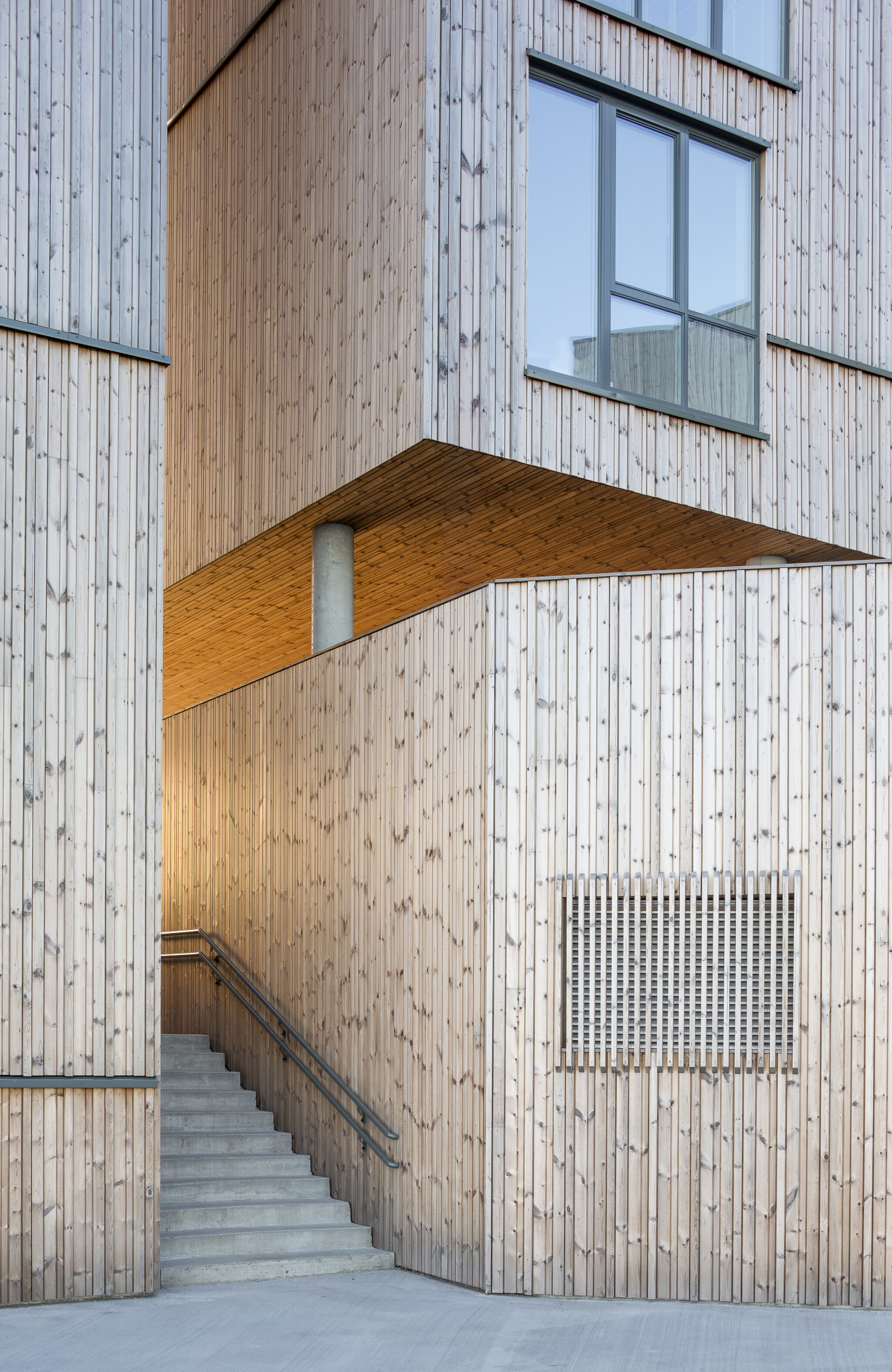 워터프론트의 지속가능한 프로젝트는 건축재로 쓰인 나무에서도 드러난다. 지역의 목조건축을 잇고 이를 지키기 위해 건축 구조는 기본적으로 노르웨이 전통의 팀버프레임 기술을 이용했다. 또한 파사드와 지붕은 친환경 인증을 받은 모엘벤(Moelven)의 탄화목을 썼다. 모엘벤의 탄화목은 열처리 목재로, 스칸디나비아 산림의 나무만을 사용한다. 가공 기술은 옛 바이킹 족들이 내구력을 강화하기 위해 나무 표면을 탄화시킨 방법을 그대로 가져왔다.