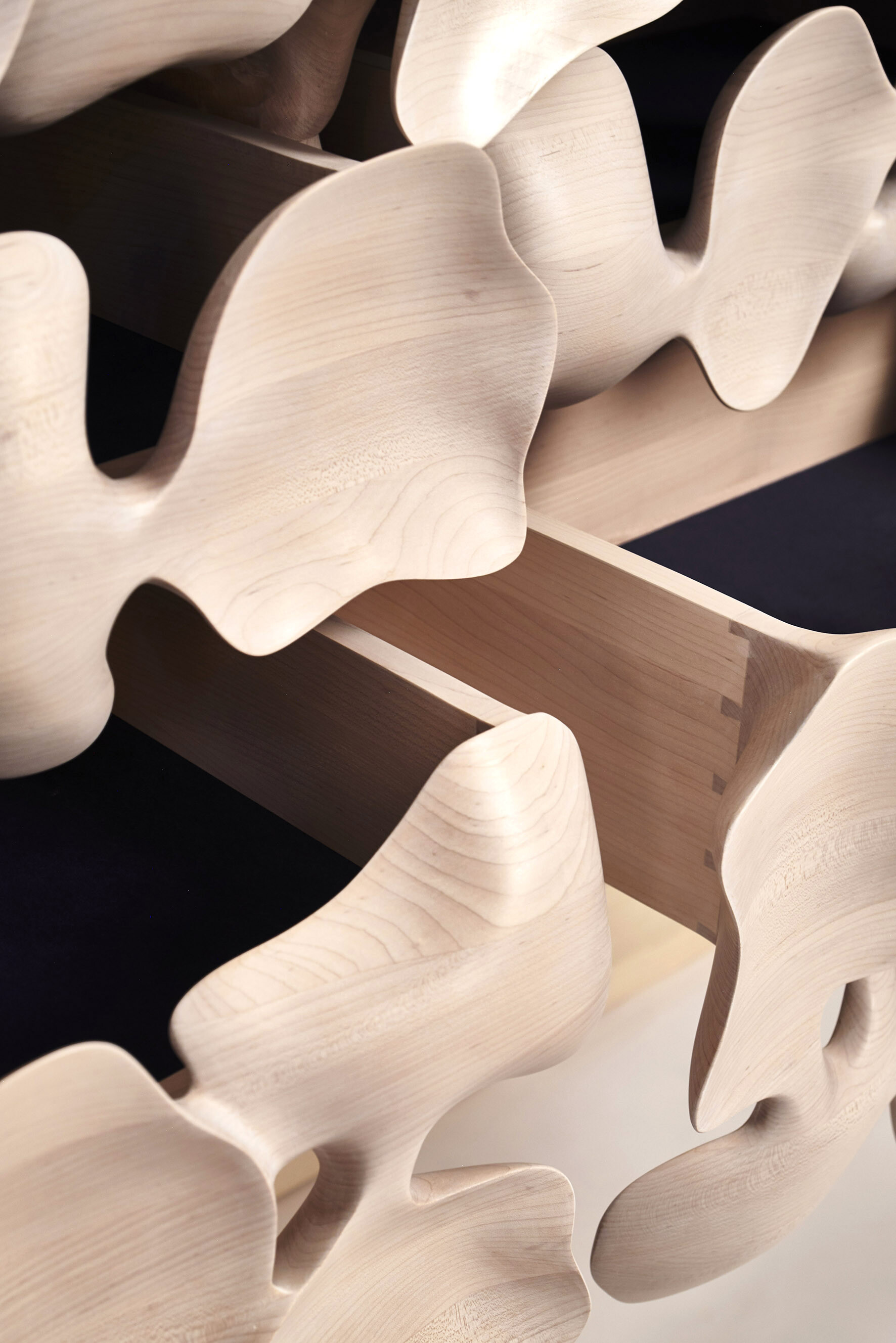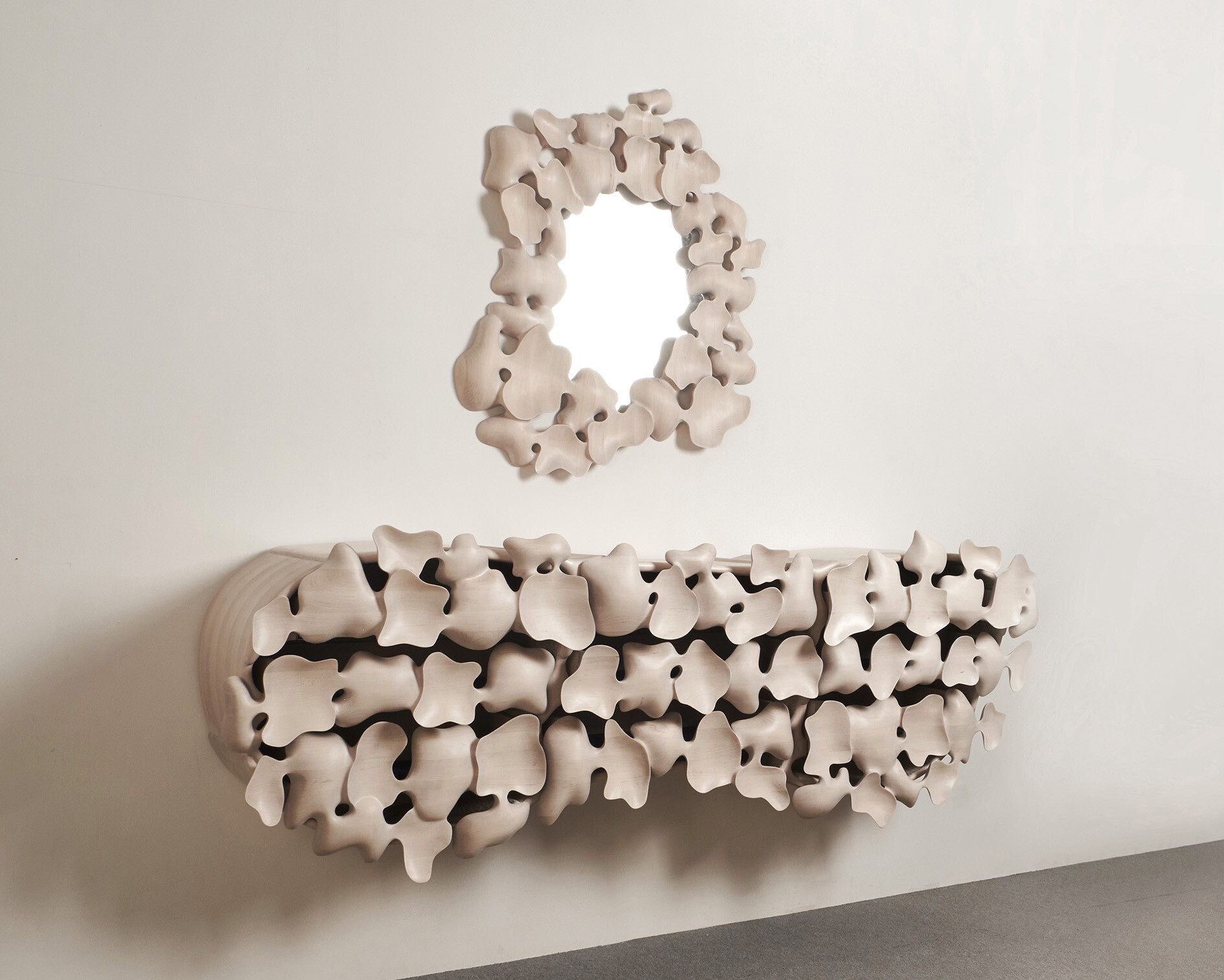 작가는 스케치를 통해 작품을 구상하고 다시 이를 3D툴로 입체화한 후, 시간과 노동을 재료에 녹여내는 수공예 방식으로 가구의 기능을 조형의 아름다움으로 치환했다.
